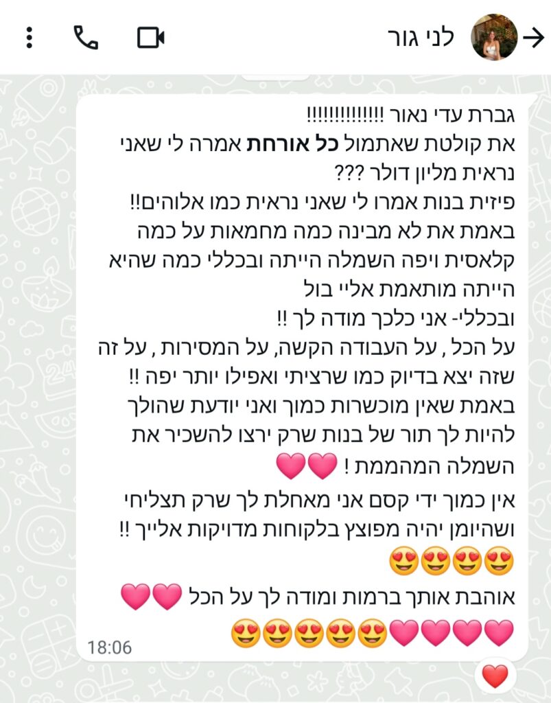 ואני כאן כדי ללוות אותך בתהליך אישי, רגוע ומדויק. מאז ומתמיד נמשכתי לקסם שביצירה ולפרטים הקטנים שעושים את כל ההבדל. אני מלווה כלות שמחפשות משהו אחר לא שמלה מוכנה, אלא תהליך של הקשבה, ביטחון ושקט, שבו ניצור יחד שמלה שנבנית במיוחד עבורך. כל שמלה נתפרת מאפס, בהתאמה מלאה וללא פשרות, בלי פס ייצור ובלי קיצורי דרך רק דיוק, מקצועיות וליווי אישי.