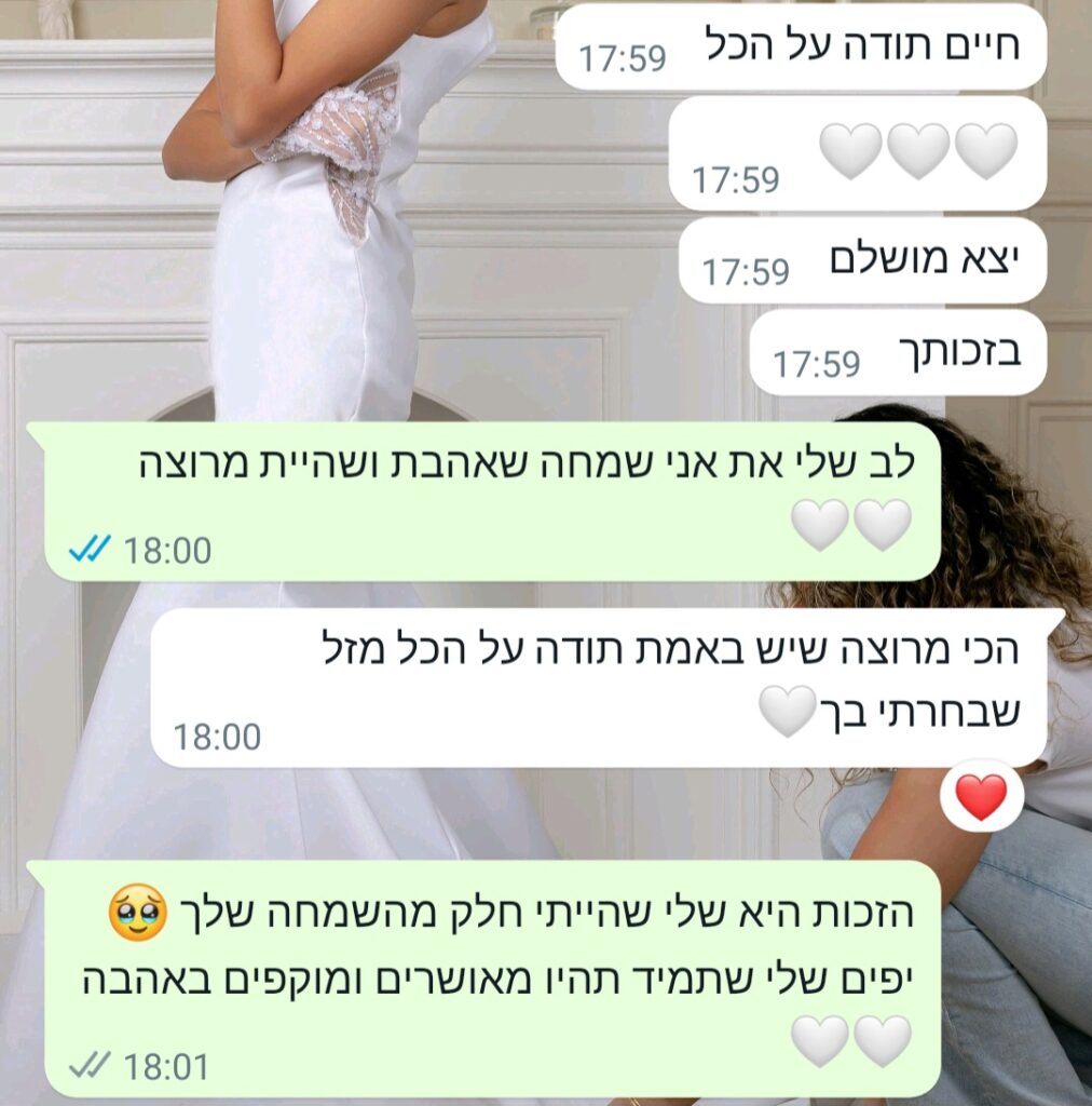 ביום החתונה שלך אני מלווה אותך. אני שם כדי לוודא שהשמלה יושבת בדיוק כמו שחלמנו, כדי לסדר, להרגיע, ולתת לך שקט. יש מי שמכירה אותך ואת השמלה שלך עד הפרט האחרון. כדי שאת תוכלי להיות רגועה, ולהיות נוכחת באמת ברגע.